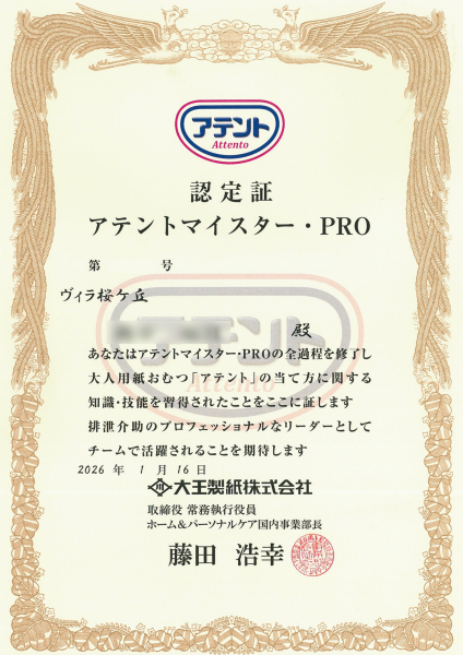 「アテントマイスタープロ」とは、2017年より、大王製紙株式会社が認定している、紙おむつの正しい使い方や、排泄に関するアドバイス・提案・サポートについて正しい知識と技術を習得し、ご利用者様の排泄ケアに活かす為の資格制度です。
