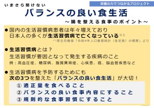 今回のイベントは、一般財団法人日本栄養実践科学戦略機構が推進する「栄養の力でつながるプロジェクト ~管理栄養士・栄養士の栄養でつながるウェルビーイングな未来社会の実現プロジェクト~」(通称:栄養つなプロ)の一環として、株式会社ヤクルト本社の協賛により、ご提供いただいた「Y1000 糖質オフ」の試飲や「ヘルシーダイアリー」(栄養指導媒体)を活用しています。